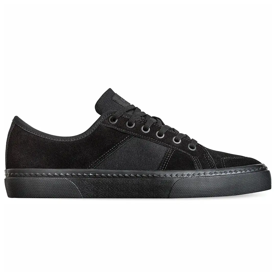 The Surplus in Black/Black is a vulcanized skate style featuring Globe’s Shockbed™ insole for enhanced comfort and a reinforced rubber toe for protection. Also features minimal tongue and collar padding and flattened vamp for a sleek, low silhouette. Made from shaved suede/canvas.